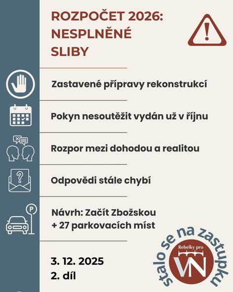 Ani doplnění pana místostarosty situaci nevyjasnilo. Otázka, která zůstává bez odpovědi. Jak chce město vysvětlit odklad lidem, kterým bylo opakovaně sdělováno, že se příprava rekonstrukcí jejich ulic spustí už letos? Co jsme tedy navrhly. Do rozpočtu byla zařazena oprava chodníků v ulici Zbožská (3,5 milionu Kč). Je to jen část původního balíku, ale chtěly jsme, aby se alespoň něco ze slibu lidem začalo skutečně naplňovat.