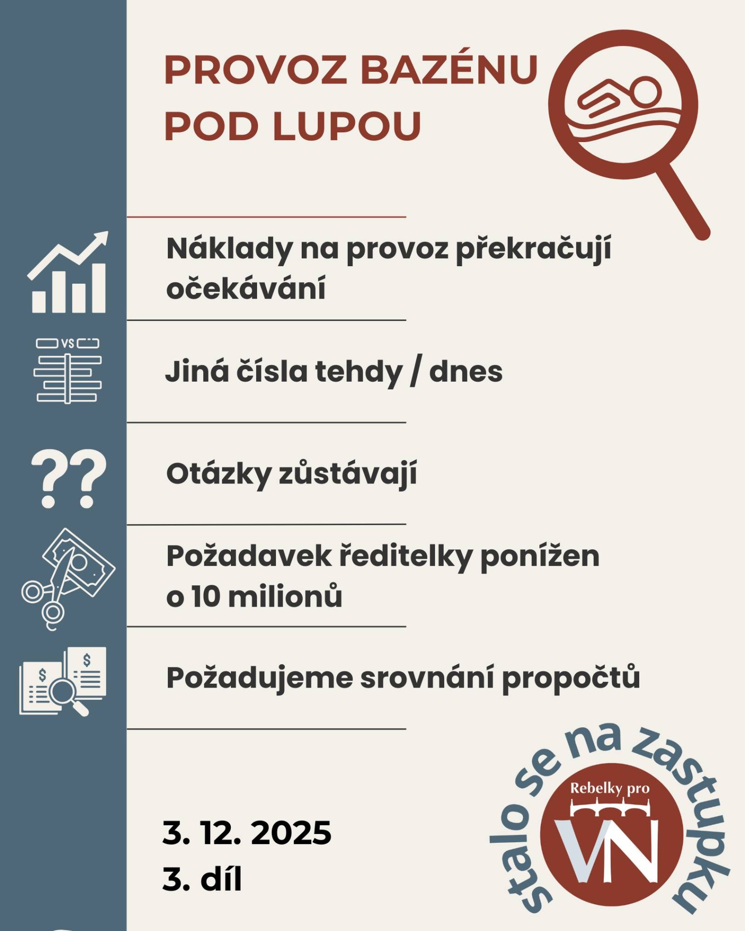 Zastupitelé se na jednání vrátili k otázce, která nedá spát mnohým z nás: Proč se dnešní předpokládané nároky na provoz nového městského bazénu tak výrazně liší od toho, co zaznívalo v době rozhodování o jeho stavbě?